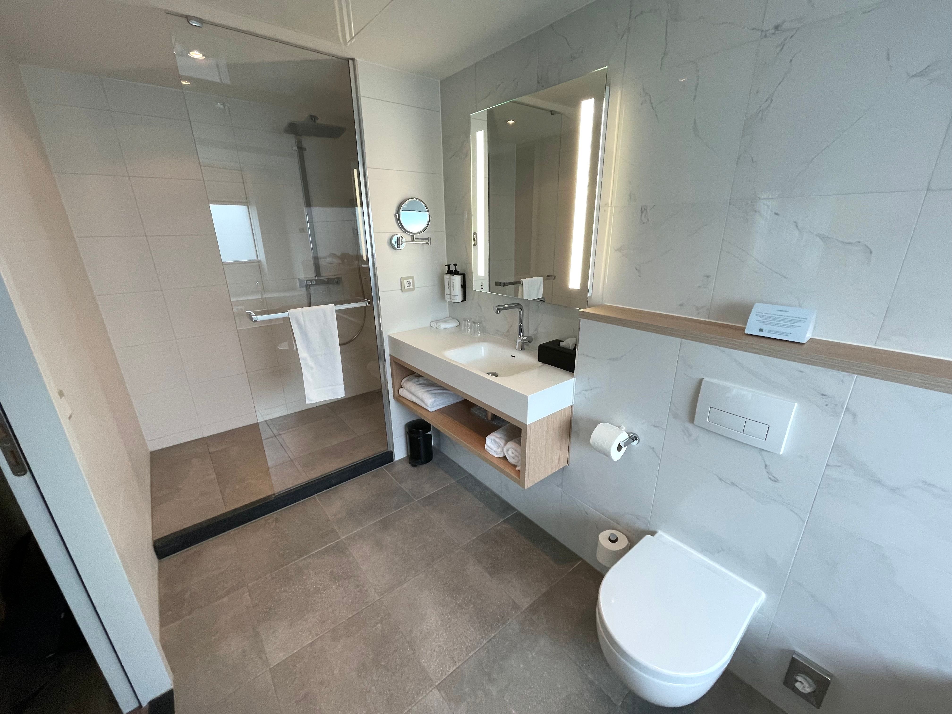 The curved exterior shows up inside, giving you a long run of windows rather than a flat wall. It’s the one feature that separates it from a standard business hotel room.